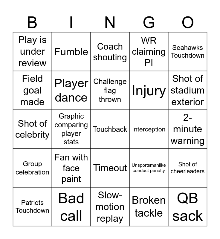 This bingo card has 25 words: Fan with face paint, Slow-motion replay, Challenge flag thrown, Patriots Touchdown, Seahawks Touchdown, Play is under review, Field goal made, Fumble, Interception, Timeout, Injury, Shot of celebrity, Unsportsmanlike conduct penalty, Shot of cheerleaders, Player dance, QB sack, 2-minute warning, Coach shouting, Shot of stadium exterior, Graphic comparing player stats, Touchback, Bad call, Group celebration, WR claiming PI and Broken tackle.