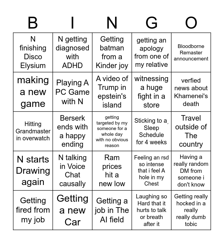 This bingo card has a free space and 24 words: N talking in Voice Chat causally, Getting a new Car, A video of Trump in epstein's island, Getting fired from my job, Bloodborne Remaster announcement, N finishing Disco Elysium, making a new game, N getting diagnosed with ADHD, Sticking to a ٍ Sleep Schedule for 4 weeks, Ram prices hit a new low, witnessing a huge fight in a store, Hitting Grandmaster in overwatch, Feeling an rsd so intense that i feel A hole in my Chest, Having a really random DM from someone i don't know, Playing A PC Game with N, Laughing so Hard that it hurts to talk or breath after it, Travel outside of The country, Getting batman from a Kinder joy, verfied news about Khamenei's death, Berserk ends with a happy ending, Getting really hocked in a really really dumb tobic, N starts Drawing again, getting an apology from one of my relative and Getting a job in The AI field.