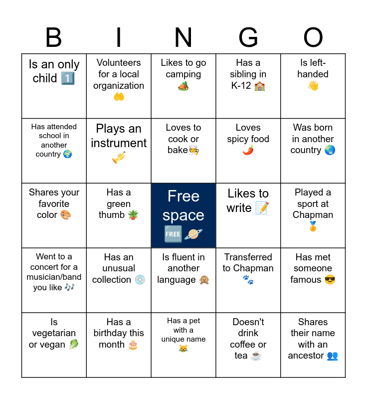 This bingo card has a free space and 24 words: Has an unusual collection 💿, Has a birthday this month 🎂, Loves to cook or bake🧑🍳, Is vegetarian or vegan 🥬, Is left-handed 👋, Is an only child 1️⃣, Has attended school in another country 🌍, Volunteers for a local organization 🤲, Likes to write 📝, Is fluent in another language 🙊, Loves spicy food 🌶️, Shares your favorite color 🎨, Transferred to Chapman 🐾, Has met someone famous 😎, Plays an instrument 🎺, Doesn't drink coffee or tea ☕, Played a sport at Chapman 🏅, Likes to go camping 🏕️, Was born in another country 🌏, Has a green thumb 🪴, Shares their name with an ancestor 👥, Went to a concert for a musician/band you like 🎶, Has a sibling in K-12 🏫 and Has a pet with a unique name 😹.