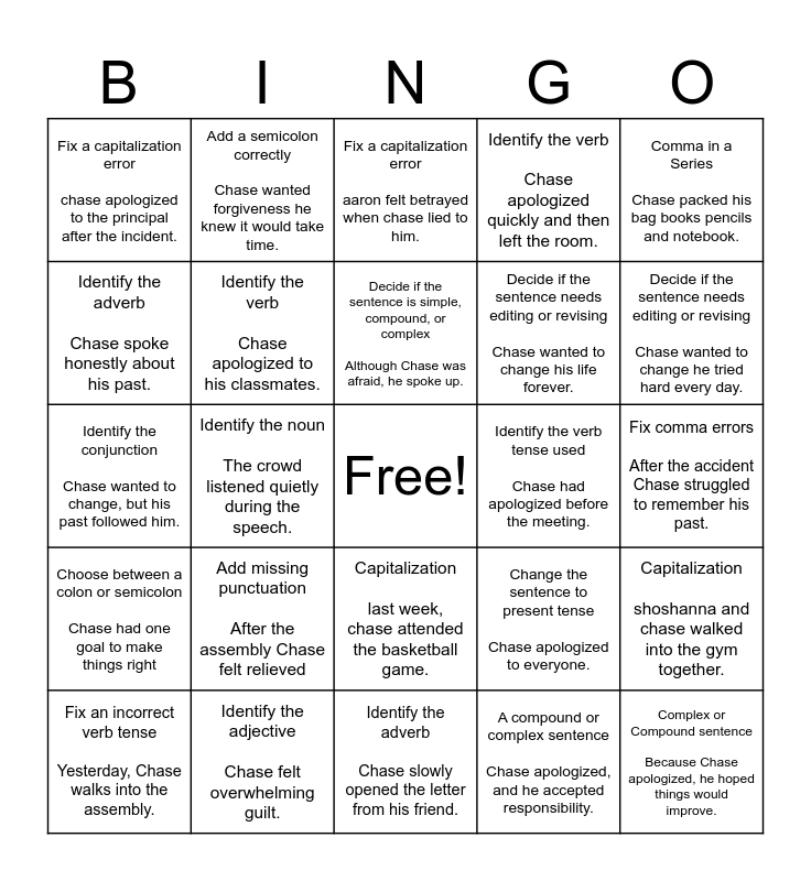 This bingo card has a free space and 24 words: Add missing punctuation After the assembly Chase felt relieved, Identify the adjective Chase felt overwhelming guilt., Decide if the sentence is simple, compound, or complex Although Chase was afraid, he spoke up., Fix an incorrect verb tense Yesterday, Chase walks into the assembly., Comma in a Series Chase packed his bag books pencils and notebook., Fix a capitalization error chase apologized to the principal after the incident., Identify the adverb Chase spoke honestly about his past., Add a semicolon correctly Chase wanted forgiveness he knew it would take time., Identify the verb tense used Chase had apologized before the meeting., Capitalization last week, chase attended the basketball game., Decide if the sentence needs editing or revising Chase wanted to change his life forever., Identify the conjunction Chase wanted to change, but his past followed him., Change the sentence to present tense Chase apologized to everyone., Capitalization shoshanna and chase walked into the gym together., Identify the verb Chase apologized to his classmates., A compound or complex sentence Chase apologized, and he accepted responsibility., Fix comma errors After the accident Chase struggled to remember his past., Fix a capitalization error aaron felt betrayed when chase lied to him., Decide if the sentence needs editing or revising Chase wanted to change he tried hard every day., Identify the noun The crowd listened quietly during the speech., Complex or Compound sentence Because Chase apologized, he hoped things would improve., Choose between a colon or semicolon Chase had one goal to make things right, Identify the verb Chase apologized quickly and then left the room. and Identify the adverb Chase slowly opened the letter from his friend..