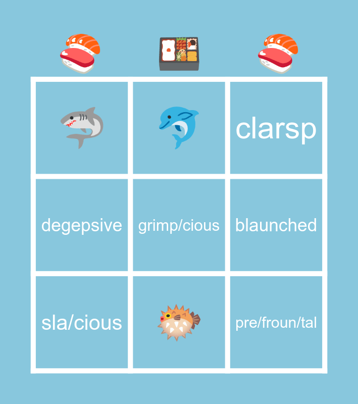 This bingo card has a free space and 8 words: blaunched, clarsp, 🐬, sla/cious, 🦈, pre/froun/tal, degepsive and 🐡.