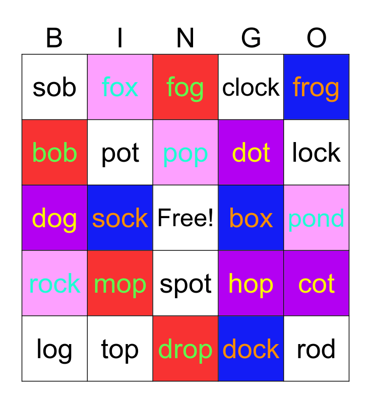 This bingo card has a free space and 24 words: mop, top, pop, log, frog, sob, bob, fox, box, spot, dot, dog, hop, cot, pot, dock, pond, fog, lock, sock, rod, rock, clock and drop.