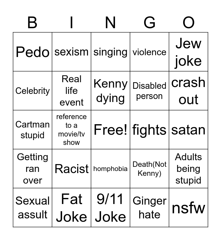 This bingo card has a free space and 24 words: Racist, Fat Joke, Kenny dying, Sexual assult, Jew joke, Pedo, Celebrity, sexism, fights, homphobia, Disabled person, Cartman stupid, Death(Not Kenny), Adults being stupid, Real life event, Ginger hate, satan, singing, crash out, reference to a movie/tv show, nsfw, Getting ran over, violence and 9/11 Joke.