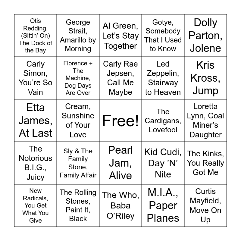 This bingo card has a free space and 75 words: 2Pac, California Love, AC/DC, Back in Black, Al Green, Let’s Stay Together, Alan Jackson, Chattahoochee, Alice in Chains, Man in the Box, Amy Winehouse, Rehab, Aretha Franklin, Chain of Fools, Ben E. King, Stand by Me, Bill Withers, Ain’t No Sunshine, Black Sabbath, Paranoid, Bobby Darin, Dream Lover, Buddy Holly, Peggy Sue, Carly Rae Jepsen, Call Me Maybe, Carly Simon, You’re So Vain, Chuck Berry, Johnny B. Goode, Cream, Sunshine of Your Love, Creedence Clearwater Revival, Fortunate Son, Curtis Mayfield, Move On Up, Deep Purple, Smoke on the Water, Dolly Parton, Jolene, Dr. Dre, Nuthin’ but a 'G' Thang (Clean), Etta James, At Last, Florence + The Machine, Dog Days Are Over, George Strait, Amarillo by Morning, Gotye, Somebody That I Used to Know, Grandmaster Flash & The Furious Five, The Message, Guns N’ Roses, Sweet Child o’ Mine, James Brown, I Got You (I Feel Good), Janis Joplin, Piece of My Heart, Jimi Hendrix, Purple Haze, John Mayer, Your Body Is a Wonderland, Johnny Cash, Ring of Fire, Keane, Somewhere Only We Know, Kid Cudi, Day ’N’ Nite, Kris Kross, Jump, Led Zeppelin, Stairway to Heaven, Little Richard, Tutti Frutti, LL Cool J, Mama Said Knock You Out, Loretta Lynn, Coal Miner’s Daughter, M.I.A., Paper Planes, Mark Ronson, Valerie, Marvin Gaye, What’s Going On, MC Hammer, U Can’t Touch This, Merle Haggard, Okie from Muskogee, Metallica, Enter Sandman, Natalie Imbruglia, Torn, New Radicals, You Get What You Give, Otis Redding, (Sittin’ On) The Dock of the Bay, Paramore, Ain’t It Fun, Parliament, Give Up the Funk, Patsy Cline, Crazy, Pearl Jam, Alive, Radiohead, Creep, Ray Charles, Hit the Road Jack, Reba McEntire, Fancy, Red Hot Chili Peppers, Under the Bridge, Run-DMC, It’s Tricky, Salt-N-Pepa, Push It, Savage Garden, Truly Madly Deeply, Seal, Kiss from a Rose, Sly & The Family Stone, Family Affair, Soundgarden, Black Hole Sun, Spin Doctors, Two Princes, Stevie Wonder, Sir Duke, The Beatles, Come Together, The Cardigans, Lovefool, The Cranberries, Linger, The Doors, Light My Fire, The Killers, Mr. Brightside, The Kinks, You Really Got Me, The Notorious B.I.G., Juicy, The Rolling Stones, Paint It, Black, The Verve, Bitter Sweet Symphony, The Who, Baba O’Riley and Vanilla Ice, Ice Ice Baby.