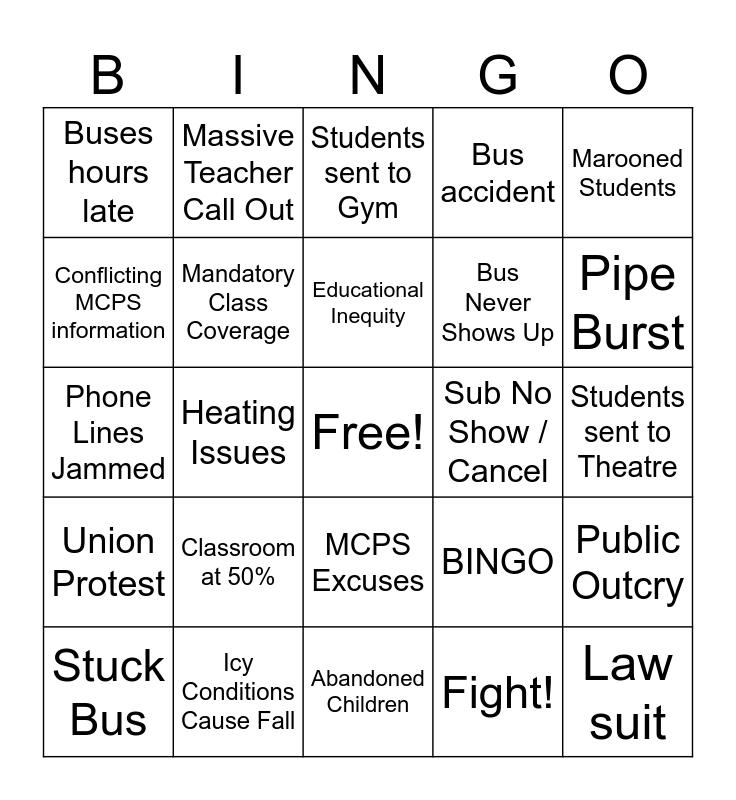 This bingo card has a free space and 25 words: Classroom at 50%, Abandoned Children, Educational Inequity, Stuck Bus, Marooned Students, Buses hours late, Conflicting MCPS information, Massive Teacher Call Out, Sub No Show / Cancel, MCPS Excuses, Bus Never Shows Up, Phone Lines Jammed, BINGO, Public Outcry, Mandatory Class Coverage, Death, Students sent to Theatre, Students sent to Gym, Pipe Burst, Heating Issues, Law suit, Icy Conditions Cause Fall, Union Protest, Bus accident and Fight!.