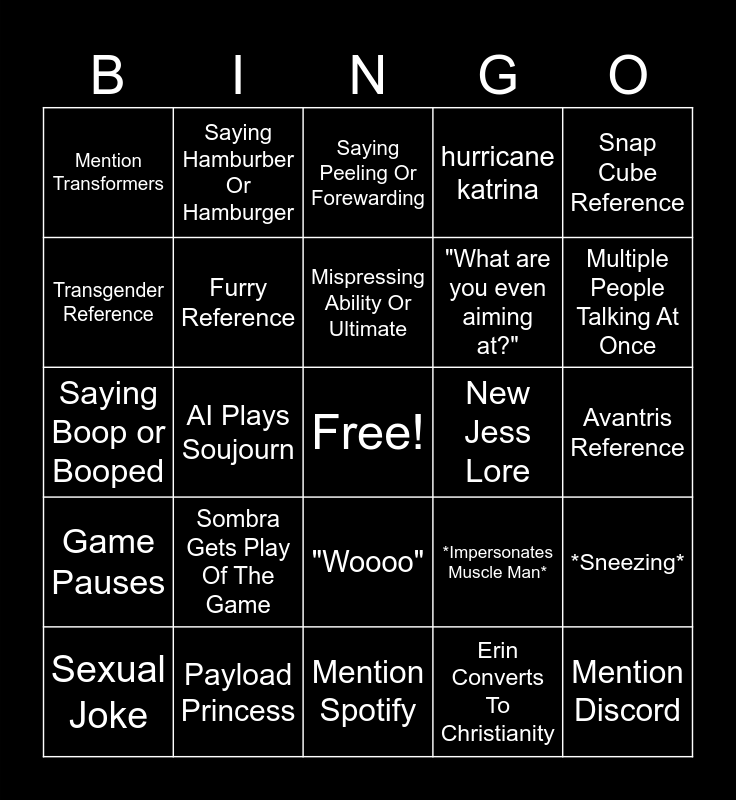 This bingo card has a free space and 24 words: Sombra Gets Play Of The Game, Payload Princess, Mispressing Ability Or Ultimate, Sexual Joke, Snap Cube Reference, Mention Transformers, Transgender Reference, Saying Hamburber Or Hamburger, New Jess Lore, "Woooo", "What are you even aiming at?", Saying Boop or Booped, *Impersonates Muscle Man*, *Sneezing*, Furry Reference, Erin Converts To Christianity, Avantris Reference, Saying Peeling Or Forewarding, Multiple People Talking At Once, AI Plays Soujourn, Mention Discord, Game Pauses, hurricane katrina and Mention Spotify.