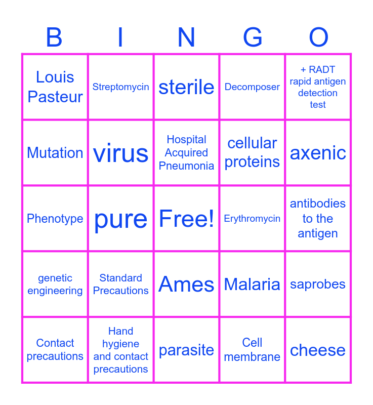This bingo card has a free space and 24 words: Standard Precautions, Hand hygiene and contact precautions, Hospital Acquired Pneumonia, Contact precautions, + RADT rapid antigen detection test, Louis Pasteur, Mutation, Streptomycin, Erythromycin, Ames, cellular proteins, Phenotype, Malaria, saprobes, virus, Cell membrane, antibodies to the antigen, sterile, axenic, pure, cheese, genetic engineering, Decomposer and parasite.