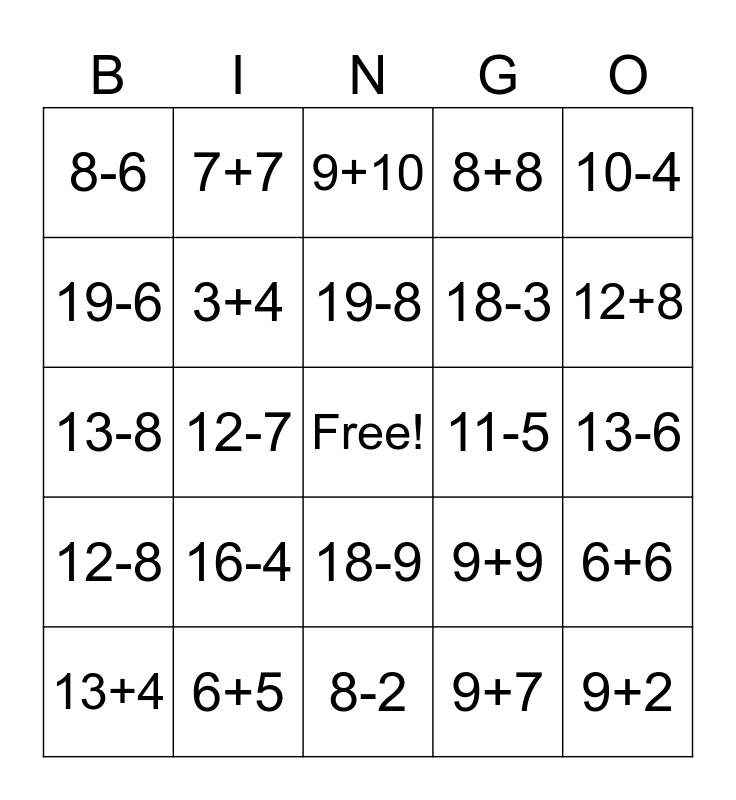 This bingo card has a free space and 29 words: 13+4, 5+11, 12-7, 5+7, 8-6, 9+10, 3+4, 16-4, 11-5, 6+5, 13-6, 9+2, 8-2, 9+7, 12+8, 14-9, 18-9, 12-8, 10-4, 13-8, 9+9, 4+12, 18-3, 19-6, 8+8, 7+7, 6+6, 19-8 and 6+8.