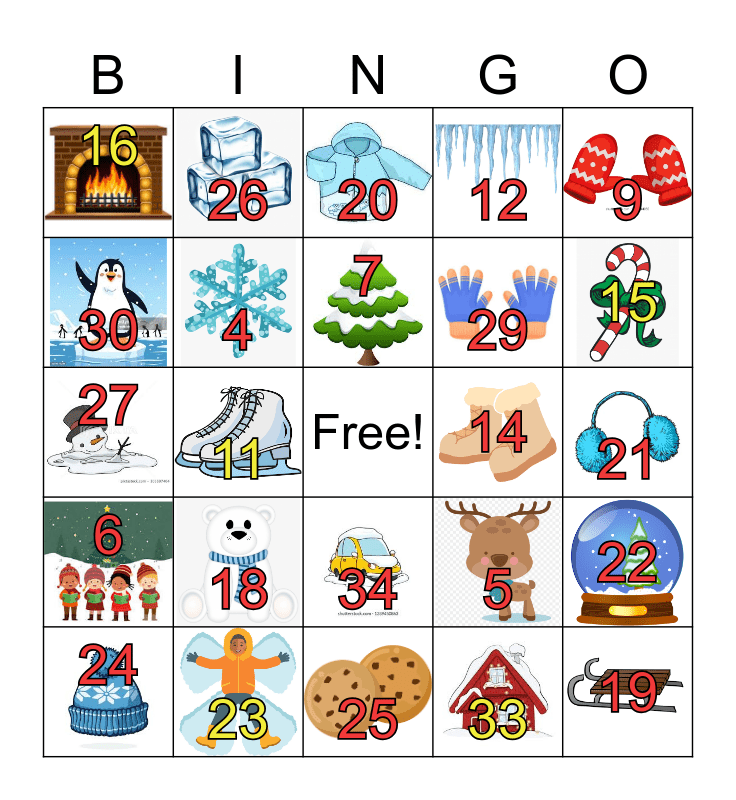 This bingo card has 36 images, a free space and 36 words: 1, 2, 3, 4, 5, 6, 7, 8, 9, 10, 11, 12, 13, 14, 15, 16, 17, 18, 19, 20, 21, 22, 23, 24, 25, 26, 27, 28, 29, 30, 31, 32, 33, 34, 35 and 36.