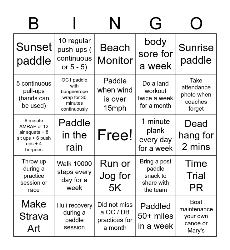 This bingo card has a free space and 26 words: Run or Jog for 5K, Paddled 50+ miles in a week, Paddle when wind is over 15mph, Huli recovery during a paddle session, Sunrise paddle, Sunset paddle, 5 continuous pull-ups (bands can be used), 10 regular push-ups ( continuous or 5 - 5), Dead hang for 2 mins, Bring a post paddle snack to share with the team, Do a land workout twice a week for a month, 8 minute AMRAP of 12 air squats + 8 sit ups + 6 push ups + 4 burpees, Time Trial PR, Make Strava Art, Paddle in the rain, Get 7 hours of sleep 5 days in a row, body sore for a week, Throw up during a practice session or race, Beach Monitor, Boat maintenance your own canoe or Mary's, Take attendance photo when coaches forget, Did not miss a OC / DB practices for a month, 1 minute plank every day for a week, Walk 10000 steps every day for a week, OC1 paddle with bungee/rope wrap for 30 minutes continuously and Write something you are thankful for every day for 30 days.