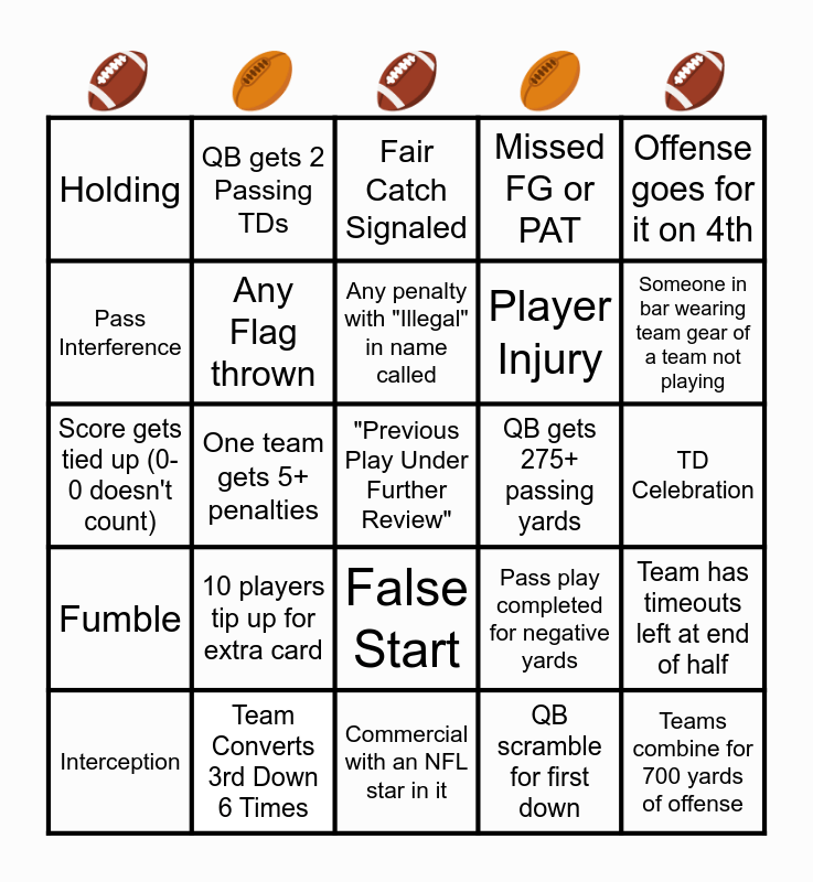 This bingo card has 54 words: Pass for 40+ yards, Fumble, 4 total sacks in game, Rushing TD, False Start, Sack, Missed FG or PAT, Defense makes 4th down stop on a run or pass play, Pass Interference, One team goes up by 10+ points, Holding, Offense converts a 3rd down and 10(or more) yards, Team Converts 3rd Down 6 Times, Interception, Run for 20+ yards, Commercial with an NFL star in it, "Previous Play Under Further Review", Player Injury, One Team uses all timeouts in a half, TD Celebration, Pass play completed for negative yards, Penalty Declined, QB gets 275+ passing yards, Offense goes for it on 4th, Player gets 80+ rushing yards, QB gets 2 Passing TDs, 45+ yard FG made, Defense holds offense to 3 and out, Player gets 100 or more Receiving yards, QB scramble for first down, Camera shows fan reaction (close up), One offense gets over 400 yards in game, 3 FGs made in game (non-PAT), Punt Return for 10+ yards, Fair Catch Signaled, Team gets more than 100 total rushing yards, Score gets tied up (0-0 doesn't count), Team has timeouts left at end of half, Teams combine for 700 yards of offense, Any Flag thrown, Team gets 18 or More First Downs in game, 5 total punts in game, Personal Foul!, FG in Red Zone, 10 players tip up for extra card, Player Celebrates on any play (non-TD), QB has at least 35 passing attempts, Offense gets first down from penalty, Any penalty with "Illegal" in name called, One team gets 5+ penalties, Someone in bar wearing team gear of a team not playing, 2 pt attempt, 3 Total Turnovers and Beer or Alcohol Commercial.
