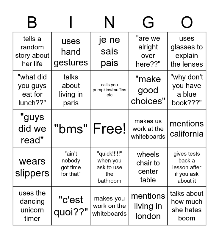 This bingo card has a free space and 24 words: "ain’t nobody got time for that", "c'est quoi??", calls you pumpkins/muffins etc, uses the dancing unicorn timer, uses glasses to explain the lenses, tells a random story about her life, "what did you guys eat for lunch??", uses hand gestures, makes us work at the whiteboards, "quick!!!!!" when you ask to use the bathroom, "make good choices", "guys did we read", wheels chair to center table, gives tests back a lesson after if you ask about it, talks about living in paris, mentions living in london, mentions california, je ne sais pais, "why don't you have a blue book???", "bms", talks about how much she hates boom, wears slippers, "are we alright over here??" and makes you work on the whiteboards.