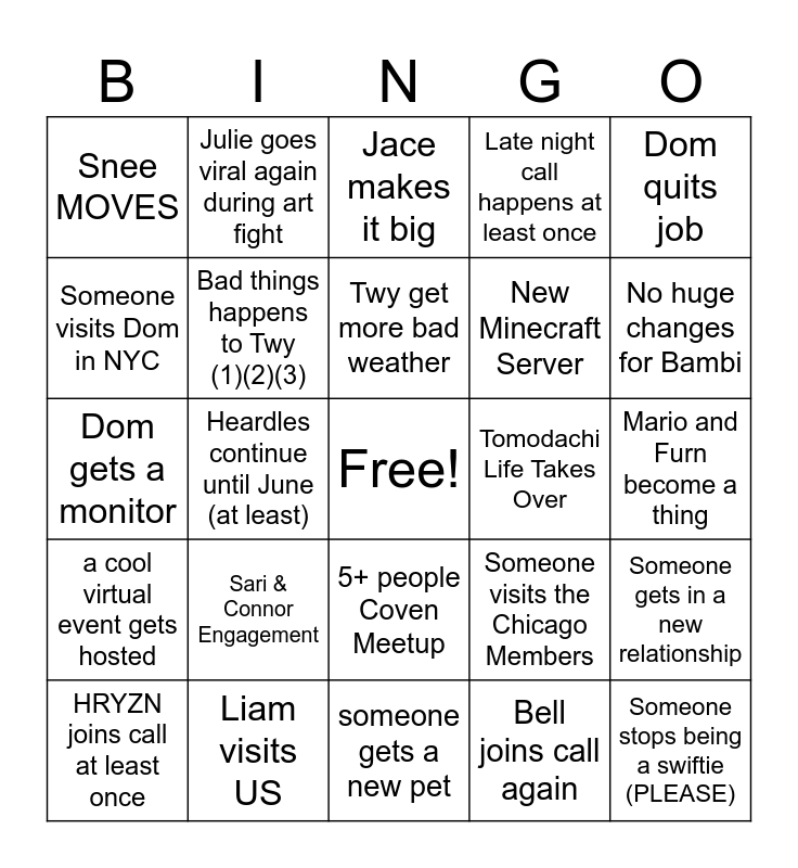 This bingo card has a free space and 24 words: Sari & Connor Engagement, Liam visits US, Twy get more bad weather, HRYZN joins call at least once, Dom quits job, Snee MOVES, Someone visits Dom in NYC, Julie goes viral again during art fight, Tomodachi Life Takes Over, 5+ people Coven Meetup, New Minecraft Server, Dom gets a monitor, Someone visits the Chicago Members, Someone gets in a new relationship, Bad things happens to Twy (1)(2)(3), Bell joins call again, Mario and Furn become a thing, Jace makes it big, No huge changes for Bambi, Heardles continue until June (at least), Someone stops being a swiftie (PLEASE), a cool virtual event gets hosted, Late night call happens at least once and someone gets a new pet.