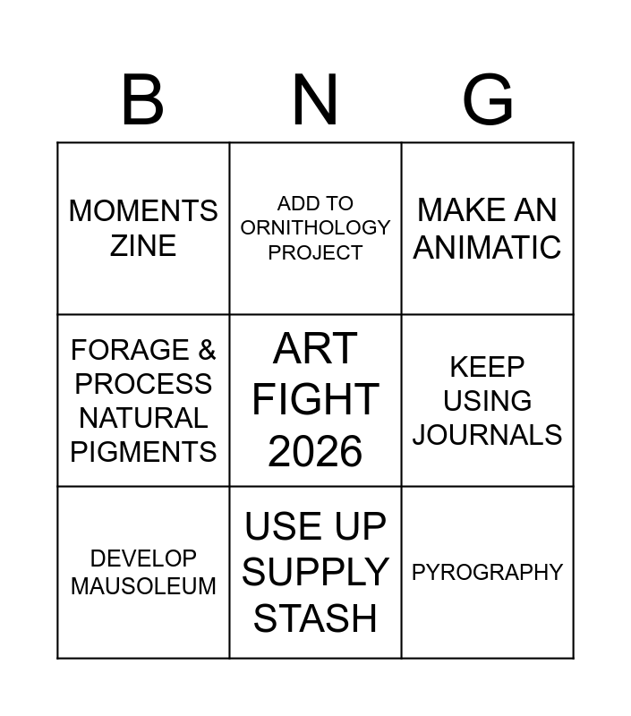 This bingo card has a free space and 11 words: TRY A NEW MEDIUM, USE UP SUPPLY STASH, PYROGRAPHY, DEVELOP MAUSOLEUM, ADD TO ORNITHOLOGY PROJECT, MAKE AN ANIMATIC, KEEP USING JOURNALS, LARGE SCALE TRADITIONAL PAINTING, FORAGE & PROCESS NATURAL PIGMENTS, MOMENTS ZINE and LARGE TRADITIONAL PAINTING.