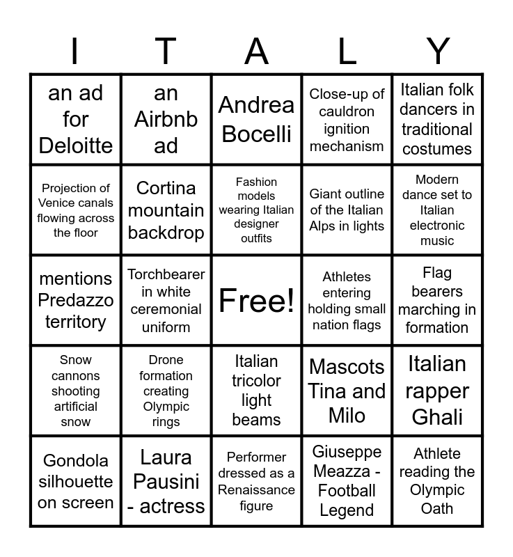 This bingo card has a free space and 39 words: Duomo di Milano projection, La Scala opera singer, Alpine ski jump projection, Cortina mountain backdrop, Gondola silhouette on screen, Italian tricolor light beams, Fashion models wearing Italian designer outfits, Vespa scooter onstage, Italian folk dancers in traditional costumes, Snow cannons shooting artificial snow, Torchbearer in white ceremonial uniform, Close‑up of cauldron ignition mechanism, Athlete reading the Olympic Oath, Flag bearers marching in formation, Athletes entering holding small nation flags, Drone formation creating Olympic rings, Flame transferring between two torches, an ad for Deloitte, Team jackets with bold country lettering, Mascots Tina and Milo, Projection of Venice canals flowing across the floor, Performer dressed as a Renaissance figure, Giant outline of the Italian Alps in lights, Modern dance set to Italian electronic music, Italian cobblestone street projection, Performer waving a massive silk tricolor flag, Opera singer hitting a dramatic high note, Digital mosaic inspired by Italian cathedrals, Vintage Italian postcards shown on big screens, an Airbnb ad, a Coca-Cola ad, Mariah Carey, Andrea Bocelli, Laura Pausini - actress, Giuseppe Meazza - Football Legend, 2 cauldrons, Italian rapper Ghali, mentions Predazzo territory and mentions Livigno territory.