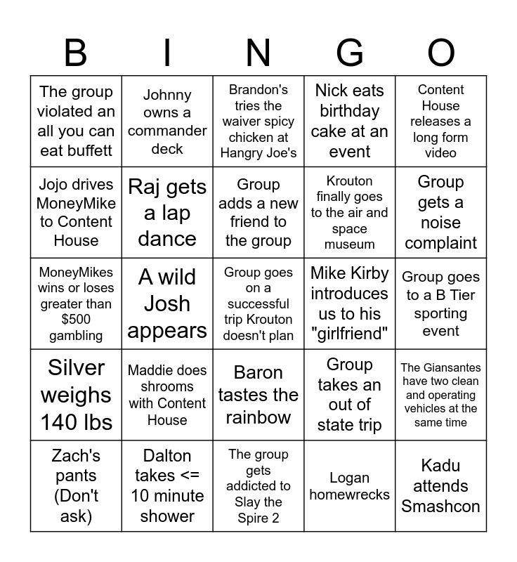 This bingo card has 25 words: Silver weighs 140 lbs, Dalton takes <= 10 minute shower, Group goes on a successful trip Krouton doesn't plan, Logan homewrecks, Content House releases a long form video, The group violated an all you can eat buffett, Johnny owns a commander deck, Brandon's tries the waiver spicy chicken at Hangry Joe's, Mike Kirby introduces us to his "girlfriend", The Giansantes have two clean and operating vehicles at the same time, Jojo drives MoneyMike to Content House, Raj gets a lap dance, The group gets addicted to Slay the Spire 2, Group takes an out of state trip, Group gets a noise complaint, Zach's pants (Don't ask), A wild Josh appears, Group adds a new friend to the group, Krouton finally goes to the air and space museum, Group goes to a B Tier sporting event, MoneyMikes wins or loses greater than $500 gambling, Maddie does shrooms with Content House, Baron tastes the rainbow, Nick eats birthday cake at an event and Kadu attends Smashcon.