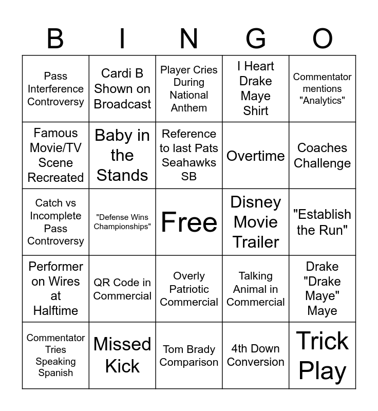 This bingo card has a free space and 29 words: Commentator Tries Speaking Spanish, Player Concussed, "Defense Wins Championships", "Execute", Pass Interference Controversy, Player Cries During National Anthem, Baby in the Stands, QR Code in Commercial, Disney Movie Trailer, Missed Kick, "Establish the Run", Trick Play, Tom Brady Comparison, 4th Down Conversion, Coaches Challenge, Extremely Specific Stat, Overly Patriotic Commercial, Performer on Wires at Halftime, Commentator mentions "Analytics", Catch vs Incomplete Pass Controversy, Talking Animal in Commercial, 3 AI Commercials, Overtime, Famous Movie/TV Scene Recreated, I Heart Drake Maye Shirt, Cardi B Shown on Broadcast, Drake "Drake Maye" Maye, Reference to last Pats Seahawks SB and 3 non-athlete celebrities in same commercial.
