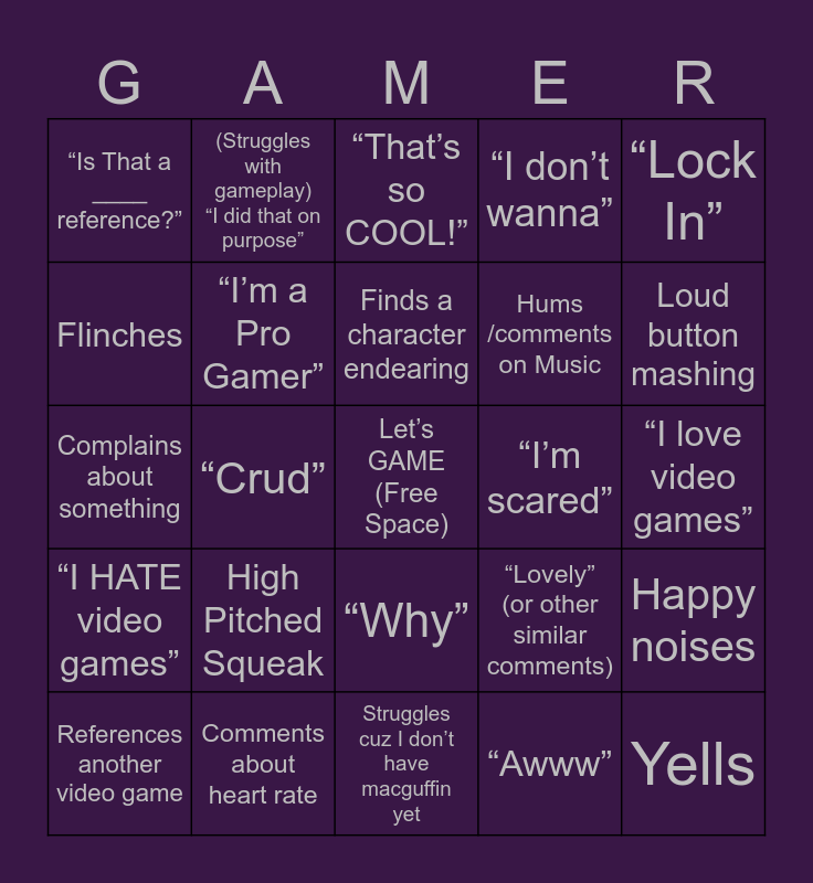 This bingo card has a free space and 24 words: High Pitched Squeak, Comments about heart rate, Finds a character endearing, References another video game, “Lock In”, “Is That a ____ reference?”, Flinches, (Struggles with gameplay) “I did that on purpose”, “I’m scared”, “Why”, Hums /comments on Music, Complains about something, “Lovely” (or other similar comments), Happy noises, “I’m a Pro Gamer”, “Awww”, “I love video games”, “That’s so COOL!”, Loud button mashing, “Crud”, Yells, “I HATE video games”, “I don’t wanna” and Struggles cuz I don’t have macguffin yet.