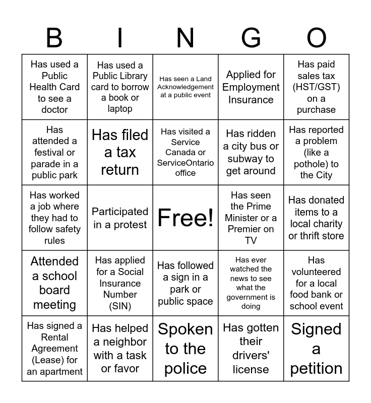 This bingo card has a free space and 24 words: Has applied for a Social Insurance Number (SIN), Has helped a neighbor with a task or favor, Has visited a Service Canada or ServiceOntario office, Has signed a Rental Agreement (Lease) for an apartment, Has paid sales tax (HST/GST) on a purchase, Has used a Public Health Card to see a doctor, Has attended a festival or parade in a public park, Has used a Public Library card to borrow a book or laptop, Has seen the Prime Minister or a Premier on TV, Has followed a sign in a park or public space, Has ridden a city bus or subway to get around, Has worked a job where they had to follow safety rules, Has ever watched the news to see what the government is doing, Has volunteered for a local food bank or school event, Has filed a tax return, Has gotten their drivers' license, Has donated items to a local charity or thrift store, Has seen a Land Acknowledgement at a public event, Has reported a problem (like a pothole) to the City, Participated in a protest, Signed a petition, Attended a school board meeting, Applied for Employment Insurance and Spoken to the police.