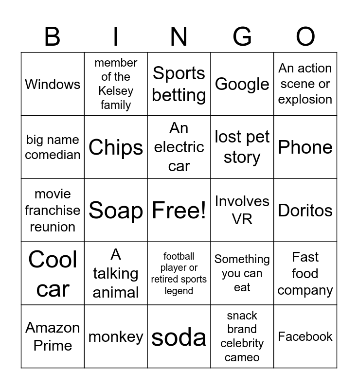 This bingo card has a free space and 36 words: A cartoon character, QuickBooks, Kia, Chips, Something you can eat, Cool car, An electric car, A famous person you recognize, An action scene or explosion, Home or auto insurance, Soap, Google, A rocket ship or space theme, Involves VR, Phone, Windows, Travel, A talking animal, Facebook, Sports betting, Doritos, Fast food company, monkey, Amazon Prime, soda, member of the Kelsey family, movie franchise reunion, literal animal mascot, lost pet story, big name comedian, chase scene involving food or drinks, nostalgic throwback song, snack brand celebrity cameo, football player or retired sports legend, tech product trying to be funny and An ad that makes no sense but looks expensive.