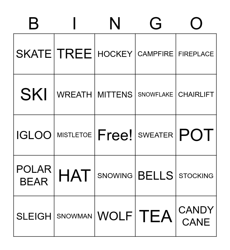 This bingo card has a free space and 24 words: HAT, SNOWMAN, MITTENS, SLEIGH, FIREPLACE, SKATE, SKI, TREE, SWEATER, SNOWING, SNOWFLAKE, IGLOO, BELLS, STOCKING, WREATH, TEA, POT, HOCKEY, CHAIRLIFT, MISTLETOE, CANDY CANE, POLAR BEAR, CAMPFIRE and WOLF.