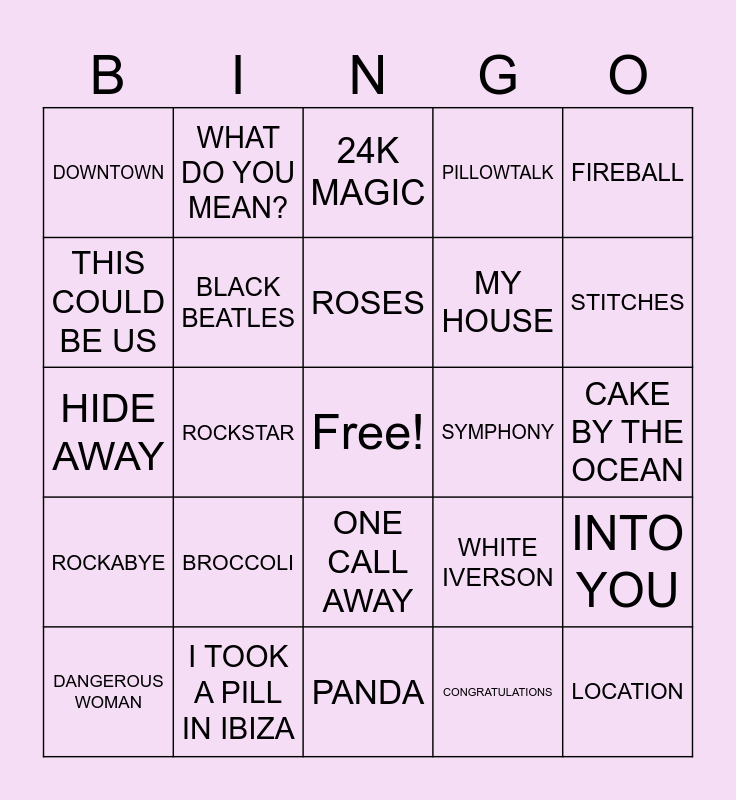 This bingo card has a free space and 34 words: HELLO, CONGRATULATIONS, SIT STILL, LOOK PRETTY, THIS IS WHAT YOU CAME FOR, ROCKABYE, BLACK BEATLES, FIREBALL, DANGEROUS WOMAN, WHAT DO YOU MEAN?, JUJU ON THAT BEAT, ROSES, 24K MAGIC, YOUR LOVE IS MY DRUG, CAN'T FEEL MY FACE, SYMPHONY, STITCHES, I TOOK A PILL IN IBIZA, HIDE AWAY, BROCCOLI, WHITE IVERSON, ONE CALL AWAY, CHEAP THRILLS, DOWNTOWN, CAKE BY THE OCEAN, PANDA, LOCATION, PILLOWTALK, OUI, MY HOUSE, THIS COULD BE US, HEARTLESS, ROCKSTAR, INTO YOU and NO.