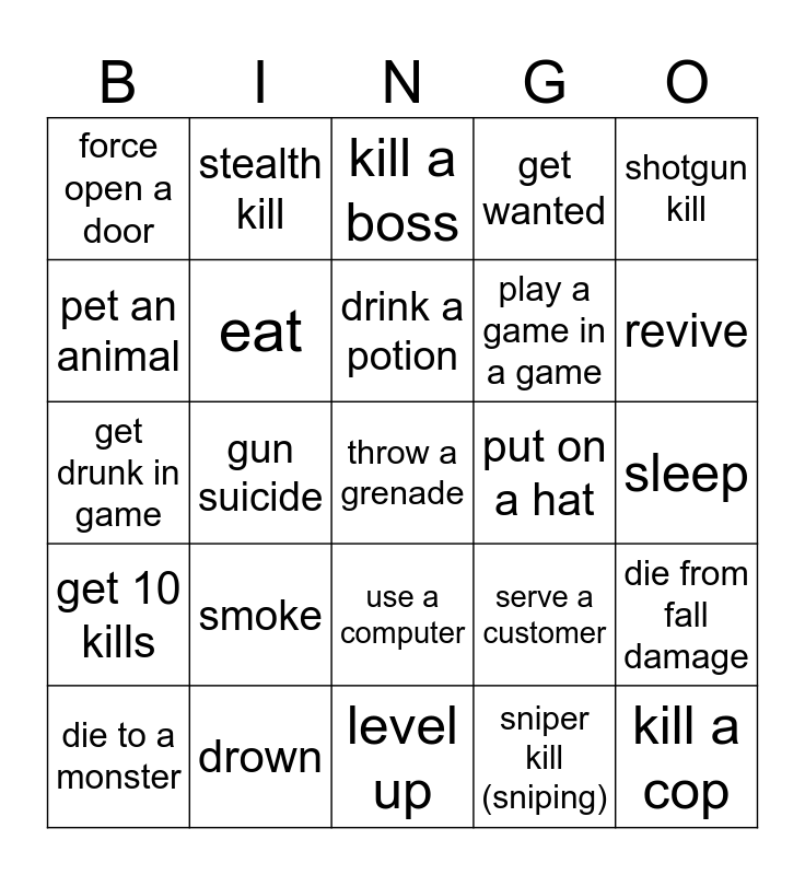 This bingo card has a free space and 27 words: serve a customer, cast a spell, play a game in a game, level up, pet an animal, kill a boss, stealth kill, get 10 kills, put on a hat, die from fall damage, get drunk in game, get wanted, die to a monster, drown, revive, make 1000$ equivalent, eat, drink a potion, smoke, force open a door, sleep, sniper kill (sniping), gun suicide, kill a cop, use a computer, shotgun kill and melee kill.