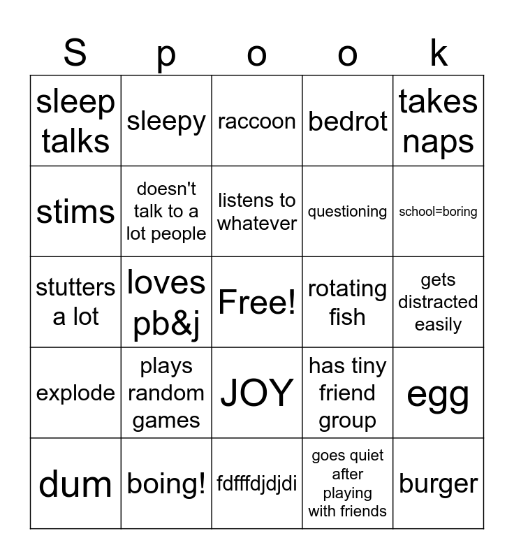 This bingo card has a free space and 24 words: dum, plays random games, listens to whatever, goes quiet after playing with friends, takes naps, sleep talks, sleepy, raccoon, rotating fish, gets distracted easily, stutters a lot, doesn't talk to a lot people, has tiny friend group, egg, stims, boing!, fdfffdjdjdi, bedrot, school=boring, explode, loves pb&j, JOY, questioning and burger.