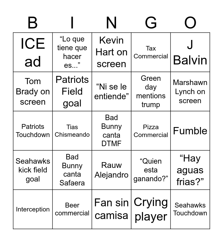This bingo card has a free space and 27 words: “Quien esta ganando?”, “Corre”, Green day mentions trump, Fan sin camisa, Tom Brady on screen, Kevin Hart on screen, “Lo que tiene que hacer es...”, Seahawks kick field goal, Pizza Commercial, “Hay aguas frias?”, Patriots Touchdown, Tax Commercial, Interception, Beer commercial, Marshawn Lynch on screen, “No way”, Patriots Field goal, “Ni se le entiende”, Bad Bunny canta Safaera, ICE ad, Fumble, Crying player, Tias Chismeando, Seahawks Touchdown, Rauw Alejandro, J Balvin and Artista Latino en asientos.