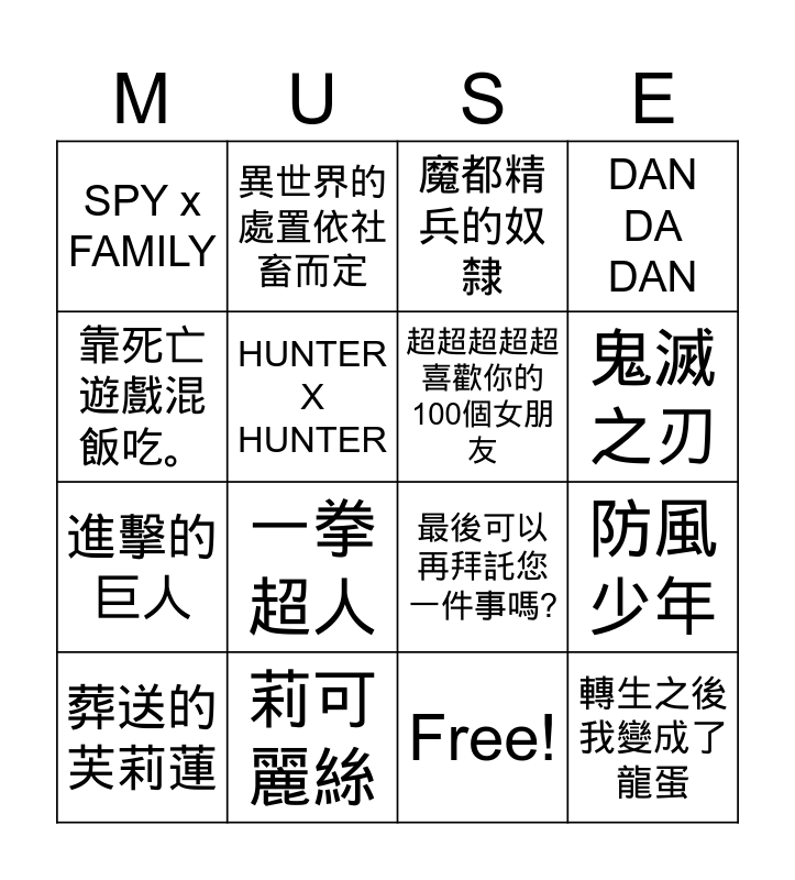 This bingo card has 17 words: Free!, 葬送的芙莉蓮, 魔都精兵的奴隸, SPY x FAMILY, 一拳超人, DAN DA DAN, 防風少年, 超超超超超喜歡你的100個女朋友, 鬼滅之刃, HUNTER X HUNTER, 莉可麗絲, 最後可以再拜託您一件事嗎?, 靠死亡遊戲混飯吃。, 異世界的處置依社畜而定, 進擊的巨人, 櫻蘭高校男公關部 and 轉生之後我變成了龍蛋.