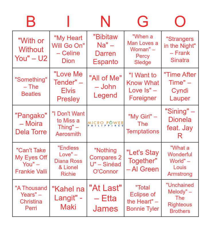 This bingo card has a free space and 46 words: "I Will Always Love You" – Whitney Houston, "Unchained Melody" – The Righteous Brothers, "Can't Help Falling in Love" – Elvis Presley, "At Last" – Etta James, "Endless Love" – Diana Ross & Lionel Richie, "Your Song" – Elton John, "My Heart Will Go On" – Celine Dion, "How Deep Is Your Love" – Bee Gees, "Something" – The Beatles, "Make You Feel My Love" – Adele, "Love Me Tender" – Elvis Presley, "When a Man Loves a Woman" – Percy Sledge, "What a Wonderful World" – Louis Armstrong, "Let's Stay Together" – Al Green, "Wonderful Tonight" – Eric Clapton, "Thinking Out Loud" – Ed Sheeran, "All of Me" – John Legend, "My Girl" – The Temptations, "At Last" – Etta James, "Strangers in the Night" – Frank Sinatra, "I Don't Want to Miss a Thing" – Aerosmith, "Total Eclipse of the Heart" – Bonnie Tyler, "With or Without You" – U2, "I Want to Know What Love Is" – Foreigner, "(Everything I Do) I Do It For You" – Bryan Adams, "Time After Time" – Cyndi Lauper, "A Thousand Years" – Christina Perri, "Always" – Bon Jovi, "Nothing Compares 2 U" – Sinéad O'Connor, "Can't Take My Eyes Off You" – Frankie Valli, "Die With A Smile" – Lady Gaga & Bruno Mars, "Man I Need" – Olivia Dean, "Multo" - Cup of Joe, "Tanging Ikaw" - Nobita, Flow G, "Dilaw" - Maki, "Kahel na Langit" - Maki, "Sining" – Dionela feat. Jay R, "Palagi" – TJ Monterde & KZ Tandingan, "Dilaw" – Maki, "Pantropiko" – BINI, "Ano Ba Meron Tayong Dalawa" – Zack Tabudlo, "Bibitaw Na" – Darren Espanto, "Pangako" – Moira Dela Torre, "Lihim" – Arthur Miguel, "Gusto" – Zack Tabudlo, Al James and "Misteryoso" – Cup of Joe.