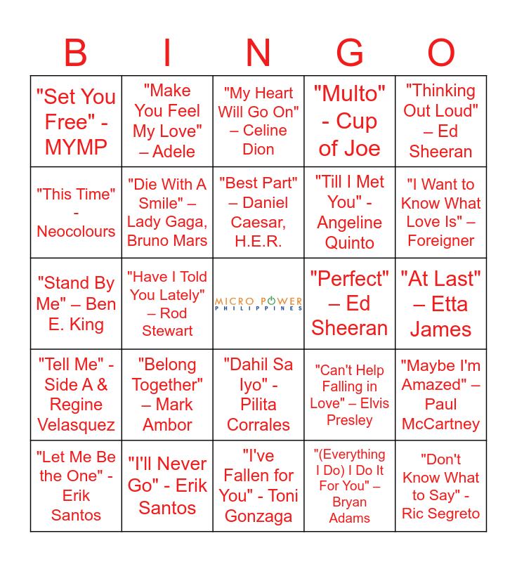 This bingo card has a free space and 54 words: "Kahit Kailan" - South Border, "Tell Me" - Side A & Regine Velasquez, "Ligaya" - Eraserheads, "Ipagpatawad Mo" - VST & Company, "Dahil Sa Iyo" - Pilita Corrales, "To Be Near You" - Freestyle, "Multo" - Cup of Joe, "Huwag Na Huwag Mong Sasabihin" - Kitchie Nadal, "This Time" - Neocolours, "Forevermore" - Side A, "Set You Free" - MYMP, "Your Love" - Alamid, "I'll Never Go" - Erik Santos, "Let Me Be the One" - Erik Santos, "Only Reminds Me of You" - MYMP, "I've Fallen for You" - Toni Gonzaga, "Don't Know What to Say" - Ric Segreto, "Till I Met You" - Angeline Quinto, "Love Moves in Mysterious Ways" - Nina Girado, "At Last" – Etta James, "Can't Help Falling in Love" – Elvis Presley, "I Will Always Love You" – Whitney Houston, "Perfect" – Ed Sheeran, "Thinking Out Loud" – Ed Sheeran, "All of Me" – John Legend, "Make You Feel My Love" – Adele, "Your Song" – Elton John, "Unchained Melody" – The Righteous Brothers, "Wonderful Tonight" – Eric Clapton, "(Everything I Do) I Do It For You" – Bryan Adams, "More Than Words" – Extreme, "Love Me Tender" – Elvis Presley, "Something" – The Beatles, "You're Still the One" – Shania Twain, "My Heart Will Go On" – Celine Dion, "I Don't Want to Miss a Thing" – Aerosmith, "Stand By Me" – Ben E. King, "Maybe I'm Amazed" – Paul McCartney, "Until I Found You" – Stephen Sanchez, "Die With A Smile" – Lady Gaga, Bruno Mars, "L-O-V-E" – Nat King Cole, "Just the Two of Us" – Grover Washington, Jr., Bill Withers, "Here, There And Everywhere" – The Beatles, "Time After Time" – Cyndi Lauper, "Belong Together" – Mark Ambor, "Stargazing" – Myles Smith, "Those Eyes" – New West, "Here With Me" – d4vd, "Best Part" – Daniel Caesar, H.E.R., "Have I Told You Lately" – Rod Stewart, "I Want to Know What Love Is" – Foreigner, "The Power of Love" – Celine Dion, "Crazy for You" – Madonna and "I Knew I Loved You" – Savage Garden.