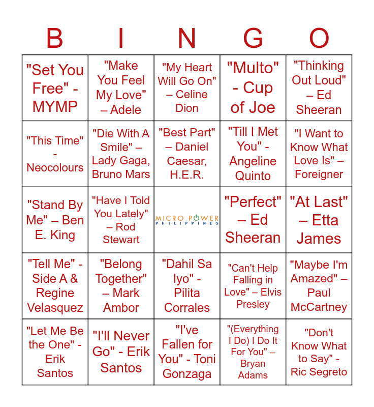 This bingo card has a free space and 54 words: "Kahit Kailan" - South Border, "Tell Me" - Side A & Regine Velasquez, "Ligaya" - Eraserheads, "Ipagpatawad Mo" - VST & Company, "Dahil Sa Iyo" - Pilita Corrales, "To Be Near You" - Freestyle, "Multo" - Cup of Joe, "Huwag Na Huwag Mong Sasabihin" - Kitchie Nadal, "This Time" - Neocolours, "Forevermore" - Side A, "Set You Free" - MYMP, "Your Love" - Alamid, "I'll Never Go" - Erik Santos, "Let Me Be the One" - Erik Santos, "Only Reminds Me of You" - MYMP, "I've Fallen for You" - Toni Gonzaga, "Don't Know What to Say" - Ric Segreto, "Till I Met You" - Angeline Quinto, "Love Moves in Mysterious Ways" - Nina Girado, "At Last" – Etta James, "Can't Help Falling in Love" – Elvis Presley, "I Will Always Love You" – Whitney Houston, "Perfect" – Ed Sheeran, "Thinking Out Loud" – Ed Sheeran, "All of Me" – John Legend, "Make You Feel My Love" – Adele, "Your Song" – Elton John, "Unchained Melody" – The Righteous Brothers, "Wonderful Tonight" – Eric Clapton, "(Everything I Do) I Do It For You" – Bryan Adams, "More Than Words" – Extreme, "Love Me Tender" – Elvis Presley, "Something" – The Beatles, "You're Still the One" – Shania Twain, "My Heart Will Go On" – Celine Dion, "I Don't Want to Miss a Thing" – Aerosmith, "Stand By Me" – Ben E. King, "Maybe I'm Amazed" – Paul McCartney, "Until I Found You" – Stephen Sanchez, "Die With A Smile" – Lady Gaga, Bruno Mars, "L-O-V-E" – Nat King Cole, "Just the Two of Us" – Grover Washington, Jr., Bill Withers, "Here, There And Everywhere" – The Beatles, "Time After Time" – Cyndi Lauper, "Belong Together" – Mark Ambor, "Stargazing" – Myles Smith, "Those Eyes" – New West, "Here With Me" – d4vd, "Best Part" – Daniel Caesar, H.E.R., "Have I Told You Lately" – Rod Stewart, "I Want to Know What Love Is" – Foreigner, "The Power of Love" – Celine Dion, "Crazy for You" – Madonna and "I Knew I Loved You" – Savage Garden.