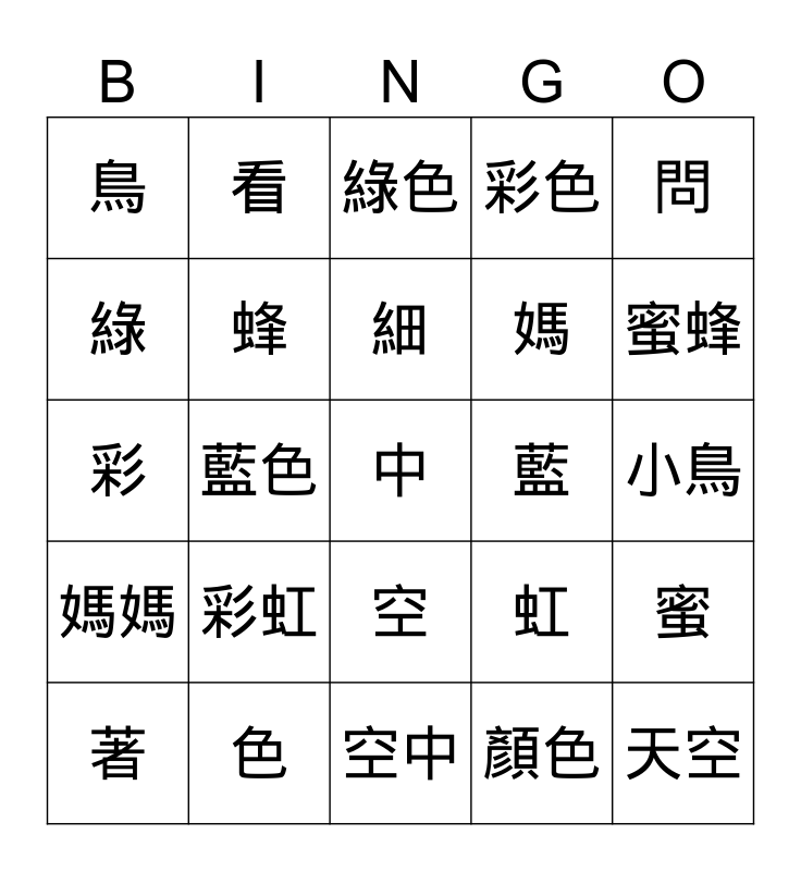 This bingo card has a free space and 24 words: 彩虹, 色, 細, 著, 問, 鳥, 綠, 看, 藍, 空, 媽, 彩, 虹, 蜜, 蜂, 顏色, 小鳥, 綠色, 蜜蜂, 藍色, 天空, 媽媽, 彩色 and 空中.