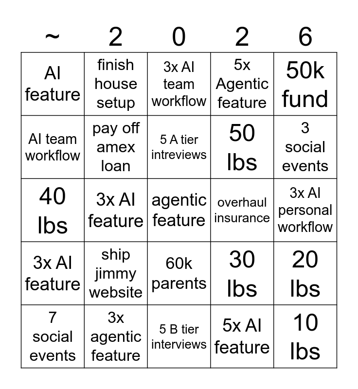 This bingo card has 25 words: ship jimmy website, 5 B tier interviews, 5 A tier intreviews, 7 social events, 50k fund, AI feature, AI team workflow, finish house setup, overhaul insurance, 60k parents, 50 lbs, 40 lbs, 30 lbs, 20 lbs, pay off amex loan, 10 lbs, 3x AI personal workflow, 3x AI team workflow, 3 social events, 3x AI feature, agentic feature, 3x agentic feature, 3x AI feature, 5x Agentic feature and 5x AI feature.