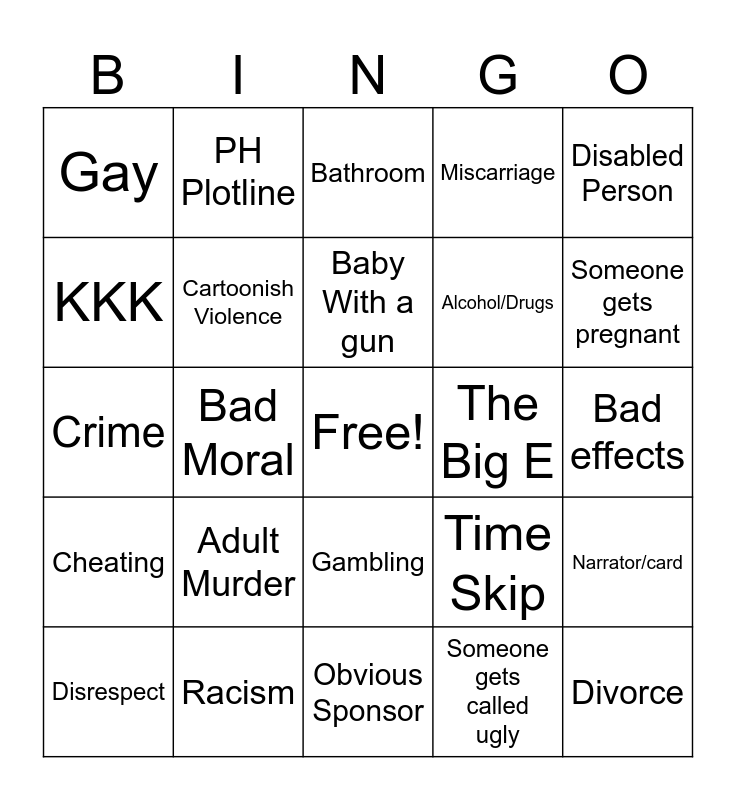 This bingo card has a free space and 24 words: Adult Murder, Racism, Baby With a gun, Disrespect, Disabled Person, Gay, KKK, PH Plotline, The Big E, Gambling, Alcohol/Drugs, Crime, Time Skip, Narrator/card, Cartoonish Violence, Someone gets called ugly, Bad effects, Bathroom, Someone gets pregnant, Bad Moral, Divorce, Cheating, Miscarriage and Obvious Sponsor.