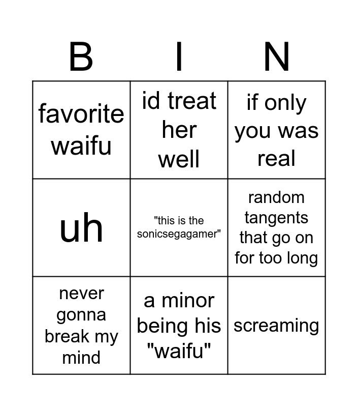 This bingo card has a free space and 9 words: never gonna break my mind, if only you was real, id treat her well, uh, favorite waifu, random tangents that go on for too long, screaming, yelling at children and a minor being his "waifu".