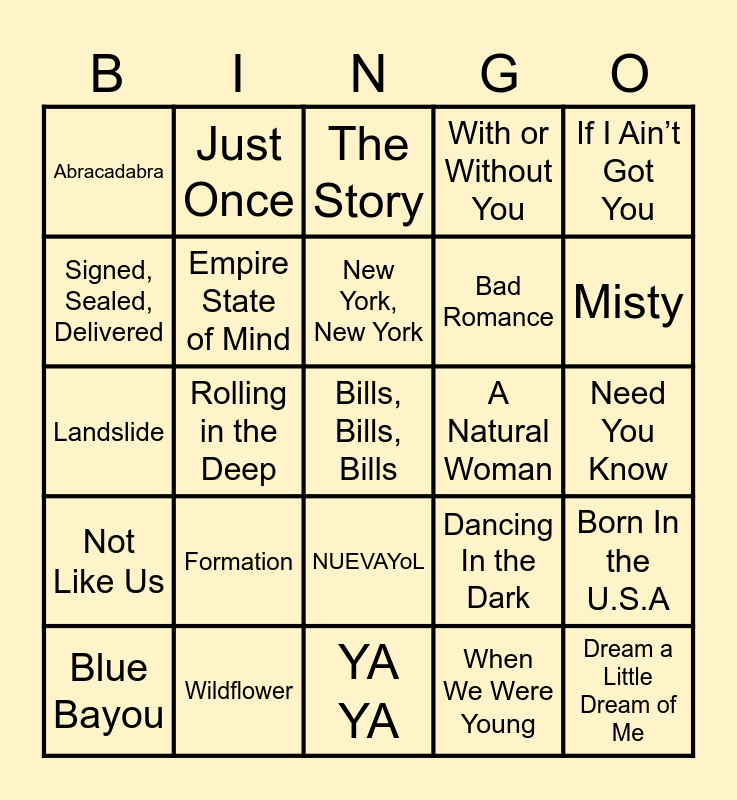 This bingo card has 51 words: Free!, Bills, Bills, Bills, Crazy In Love, YA YA, Formation, Drunk In Love, Just Once, Superstition, Signed, Sealed, Delivered, Isn’t She Lovely, Empire State of Mind, With or Without You, Born In the U.S.A, Dancing In the Dark, Here Comes The Sun, Let It Be, New York, New York, A Natural Woman, Respect, If I Ain’t Got You, Rolling in the Deep, When We Were Young, Abracadabra, Bad Romance, Blank Space, Dream a Little Dream of Me, Misty, I Can’t Make You Love Me, Blue Bayou, The Story, Big Yellow Taxi, Don’t Know Why, I’m Every Woman, Jolene, Islands In the Stream, Wildflower, Family Affair, We Found Love, If It Makes you Happy, The Will Be, Need You Know, Not Like Us, Luther, Don’t Let Our Love Start Slipping, Everlong, Goodbye Earl, Landslide, Enter Sandman, DtMF, NUEVAYoL and Man I Need.