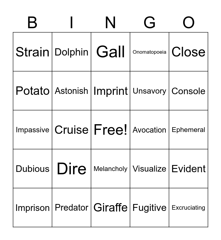 This bingo card has a free space and 24 words: Dire, Predator, Imprint, Imprison, Close, Strain, Potato, Dolphin, Avocation, Melancholy, Unsavory, Impassive, Visualize, Evident, Astonish, Fugitive, Ephemeral, Gall, Console, Cruise, Excruciating, Dubious, Onomatopoeia and Giraffe.