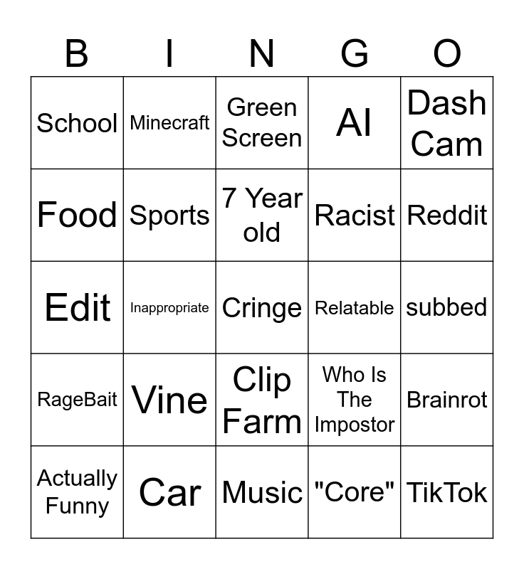This bingo card has a free space and 24 words: Vine, Car, 7 Year old, Actually Funny, Dash Cam, School, Food, Minecraft, Relatable, Clip Farm, Racist, Edit, Who Is The Impostor, Brainrot, Sports, "Core", subbed, Green Screen, Reddit, Inappropriate, TikTok, RageBait, AI and Music.