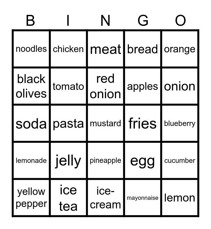 This bingo card has a free space and 49 words: yogurt, lemon, turkey, ice-cream, jelly, salad, chicken, green pepper, black olives, fish, tomato, bread, cucumber, egg, grapes, pizza, red onion, fries, banana, orange, pasta, mayonnaise, noodles, apples, peach, onion, yellow pepper, kiwi, pineapple, lemonade, popcorn, candy, orange juice, mango, ice tea, water, bubble tea, strawberry, blueberry, blackberry, raspberry, chips, chocolate, steak, soda, meat, potato, tomato and carrot.