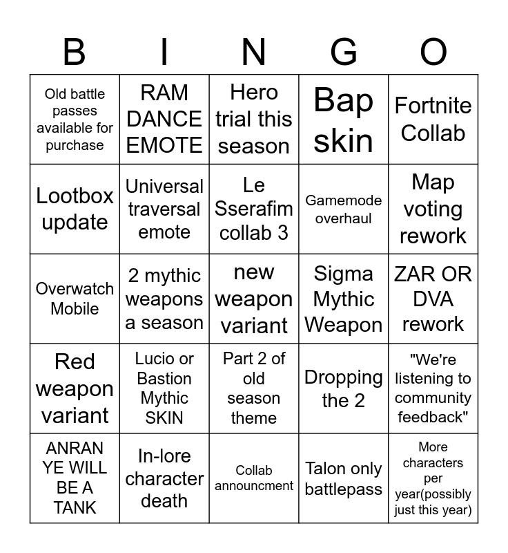 This bingo card has a free space and 24 words: Lucio or Bastion Mythic SKIN, In-lore character death, Le Sserafim collab 3, ANRAN YE WILL BE A TANK, Fortnite Collab, Old battle passes available for purchase, Lootbox update, RAM DANCE EMOTE, Sigma Mythic Weapon, Part 2 of old season theme, Gamemode overhaul, Overwatch Mobile, Dropping the 2, "We're listening to community feedback", Universal traversal emote, Talon only battlepass, ZAR OR DVA rework, Hero trial this season, Map voting rework, 2 mythic weapons a season, More characters per year(possibly just this year), Red weapon variant, Bap skin and Collab announcment.