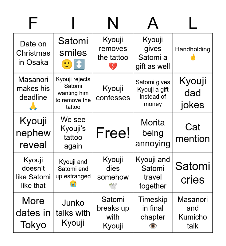 This bingo card has a free space and 24 words: Kyouji and Satomi end up estranged π, Junko talks with Kyouji, Kyouji confesses, More dates in Tokyo, Handholding π€, Date on Christmas in Osaka, Masanori makes his deadline π, Satomi smiles πββοΈ, Morita being annoying, Kyouji dies somehow ποΈ, Satomi gives Kyouji a gift instead of money, Kyouji nephew reveal, Kyouji and Satomi travel together, Satomi cries, Kyouji rejects Satomi wanting him to remove the tattoo, Timeskip in final chapter ποΈ, Cat mention, Kyouji removes the tattoo π, Kyouji dad jokes, We see Kyoujiβs tattoo again, Masanori and Kumicho talk, Kyouji doesnβt like Satomi like that, Kyouji gives Satomi a gift as well and Satomi breaks up with Kyouji.
