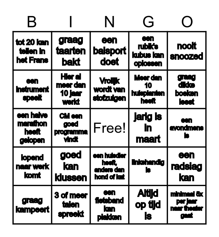 This bingo card has a free space and 24 words: goed kan klussen, 3 of meer talen spreekt, Vrolijk wordt van stofzuigen, graag kampeert, nooit snoozed, tot 20 kan tellen in het Frans, een instrument speelt, graag taarten bakt, jarig is in maart, een huisdier heeft, anders dan hond of kat, Meer dan 10 huisplanten heeft, een halve marathon heeft gelopen, linkshandig is, een radslag kan, Hier al meer dan 10 jaar werkt, Altijd op tijd is, een avondmens is, een balsport doet, graag dikke boeken leest, CM een goed programma vindt, minimaal 5x per jaar naar theater gaat, lopend naar werk komt, een rubik's kubus kan oplossen and een fietsband kan plakken.