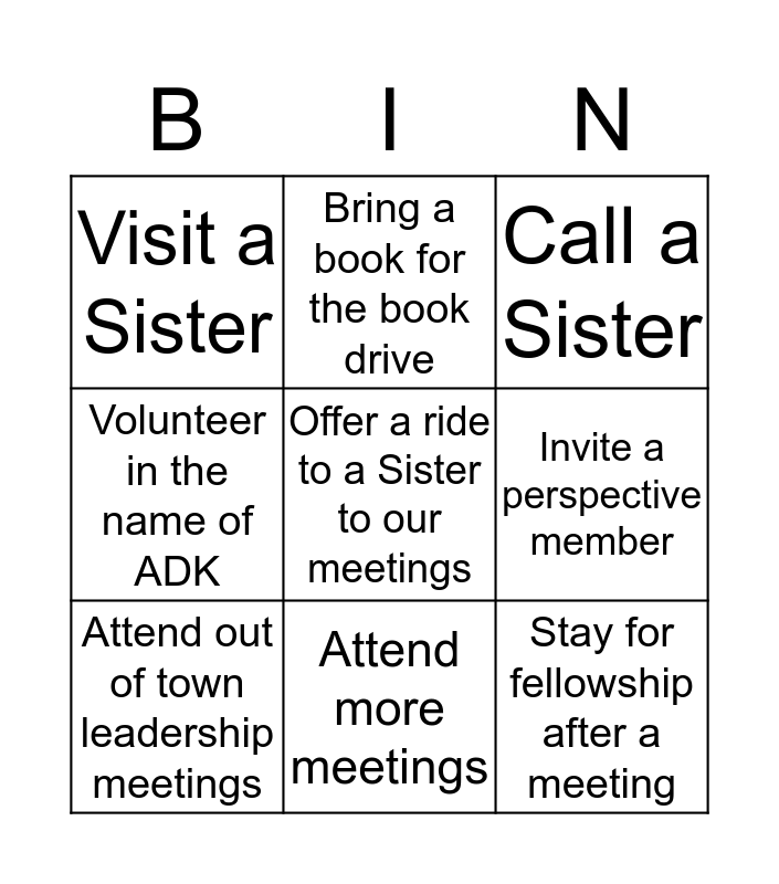 This bingo card has a free space and 8 words: Invite a perspective member, Call a Sister, Bring a book for the book drive, Attend out of town leadership meetings, Visit a Sister, Stay for fellowship after a meeting, Volunteer in the name of ADK and Attend more meetings.