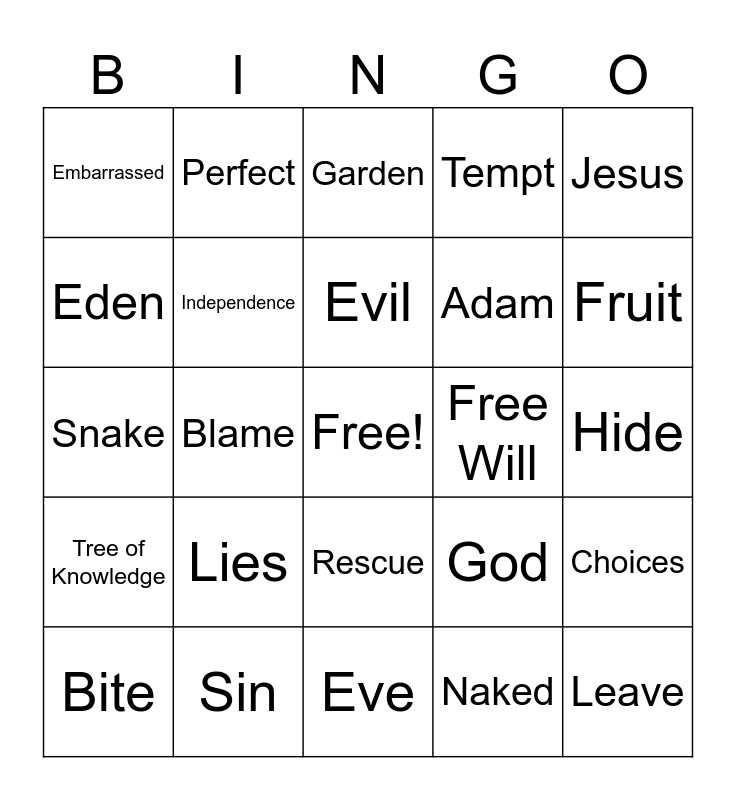 This bingo card has a free space and 27 words: God, Creation, Adam, Eve, Eden, Garden, Perfect, Tree of Knowledge, Free Will, Choices, Snake, Tempt, Bite, Sin, Fruit, Fall, Independence, Evil, Lies, Embarrassed, Hide, Naked, Blame, Leave, Rescue, Jesus and Restored.