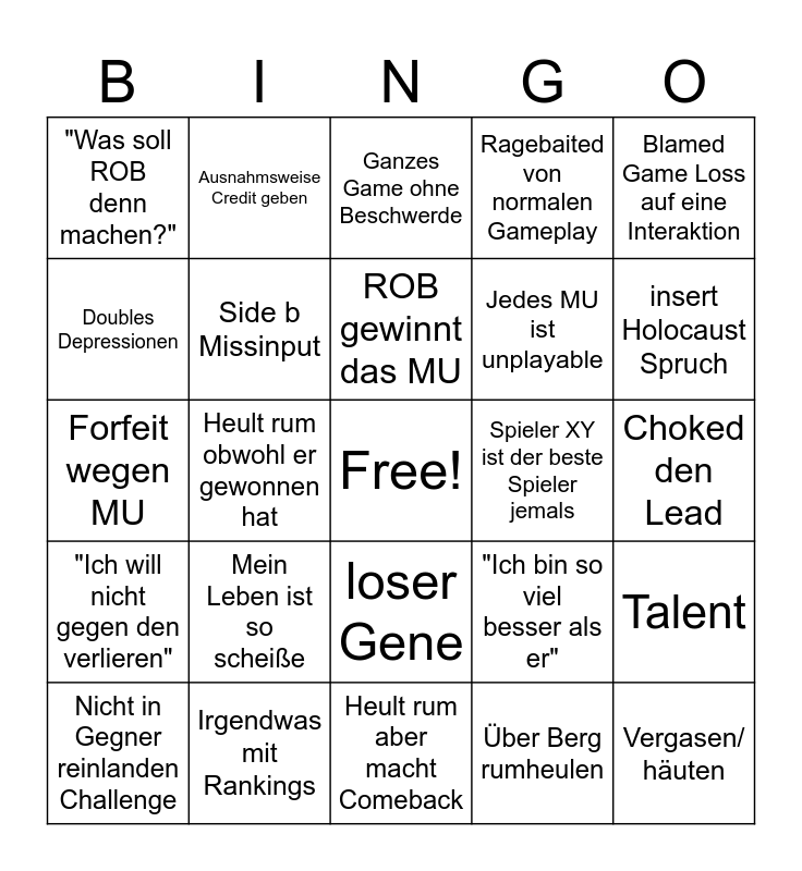 This bingo card has a free space and 24 words: Nicht in Gegner reinlanden Challenge, Mein Leben ist so scheiße, ROB gewinnt das MU, Über Berg rumheulen, Blamed Game Loss auf eine Interaktion, "Was soll ROB denn machen?", Ausnahmsweise Credit geben, Ganzes Game ohne Beschwerde, Spieler XY ist der beste Spieler jemals, Choked den Lead, Forfeit wegen MU, Side b Missinput, "Ich bin so viel besser als er", Talent, Doubles Depressionen, Irgendwas mit Rankings, Heult rum aber macht Comeback, Ragebaited von normalen Gameplay, insert Holocaust Spruch, "Ich will nicht gegen den verlieren", Heult rum obwohl er gewonnen hat, loser Gene, Jedes MU ist unplayable and Vergasen/ häuten.
