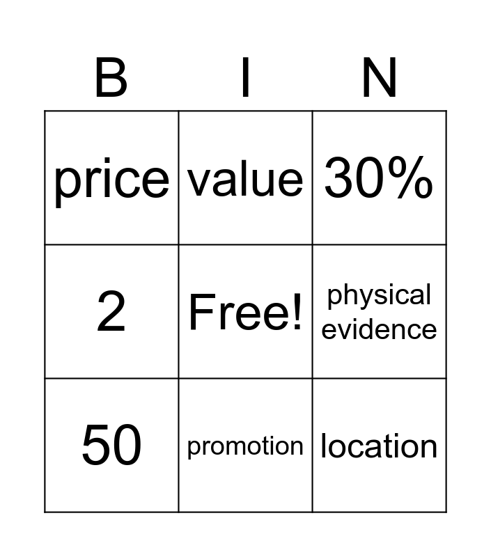 This bingo card has a free space and 17 words: place, product, 30%, price, value, 2, 100, 50, promotion, physical evidence, receipt, bundle, location, value, service, goods and discount.
