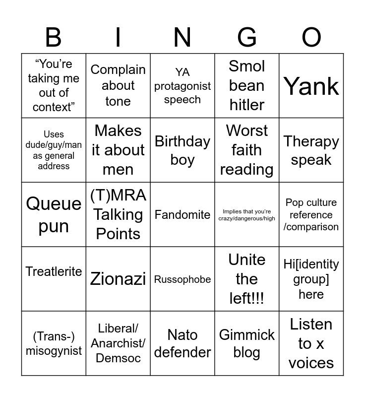 This bingo card has a free space and 24 words: Zionazi, Liberal/ Anarchist/ Demsoc, Birthday boy, (Trans-) misogynist, Yank, “You’re taking me out of context”, Uses dude/guy/man as general address, Complain about tone, Implies that you’re crazy/dangerous/high, Russophobe, Worst faith reading, Queue pun, Unite the left!!!, Hi[identity group] here, Makes it about men, Gimmick blog, Pop culture reference /comparison, YA protagonist speech, Therapy speak, (T)MRA Talking Points, Listen to x voices, Treatlerite, Smol bean hitler and Nato defender.