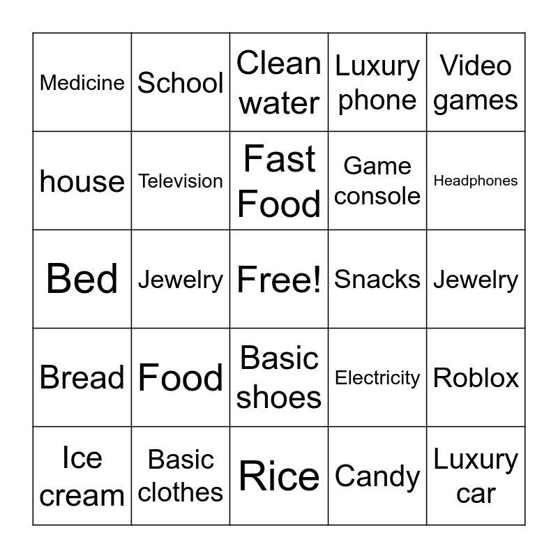 This bingo card has a free space and 24 words: Ice cream, Food, Fast Food, Candy, Video games, Medicine, School, Clean water, Snacks, Jewelry, Bed, Television, Electricity, Roblox, house, Basic clothes, Rice, Luxury phone, Headphones, Bread, Jewelry, Basic shoes, Game console and Luxury car.